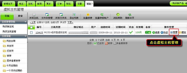 1、进入控制中心的“虚拟主机管理”,点击主机右边的“管理”